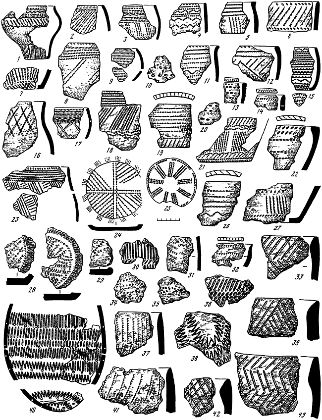 Для обеих групп памятников характерны большие сосуды из глины с примесью шамота, хорошо сглаженной поверхностью, сильного обжига, широкогорлые, полуяйцевидной формы, с острым или округлым дном, наклонным внутрь краем с характерным наплывом (рис. 81). Вся поверхность сосудов покрыта гребенчатым орнаментом в виде горизонтальных зон и рядов косых отпечатков длинной гребенки, треугольников, заполненных оттисками штампа разного наклона, ромбов, вертикального зигзага («шагающей гребенки») и др. Иногда к гребенчатому примешивается неглубокий ямчатый орнамент, а также узор из насечек и прочерченных линий (рис. 81, 33).