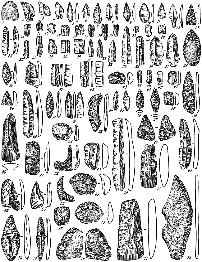 Каменный инвентарь в Верхнем Прикамье характеризуется первичным расщеплением на отщепы, в Нижнем Прикамье – на отщепы и пластины. В целом для Верхнего Прикамья характерны двусторонне обработанные формы: листовидные и ромбические наконечники стрел, крупные одно– и двулезвийные ножи со сплошной и краевой ретушью из отщепов и плиток кремня, проколки и сверла, разнообразие скребков (рис. 82). Присутствуют и сланцевые шлифованные топоры, многочисленны сланцевые штампы. В Нижнем Прикамье двусторонне обработанному инвентарю сопутствуют изделия из пластин.