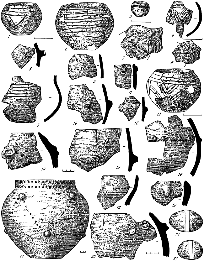Незвиско: 1-20 – фрагменты сосудов (жилище № 13); 21, 22 – глиняные грузила.