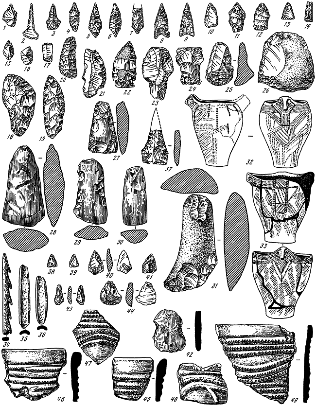 В первом культурном слое найдены (рис. 105, 1-34) наконечники копий и стрел листовидной формы с выемкой в основании и подтреугольные с вогнутой базой, обработанные иногда с двух сторон диагонально направленной ретушью; ножи листовидные и на пластинах; треугольные и удлиненно-овальные скребки с выпуклым рабочим краем; скребла и выемчатые скобели; угловые, срединные и многофасеточные с уплощенной рукояткой резцы. Топоры и тесла имеют прямоугольные, подтреугольные, трапециевидные и асимметричные уплощенно-овальные поперечные сечения. Многочисленные ножевидные пластинки сколоты с конических и подпризматических нуклеусов.