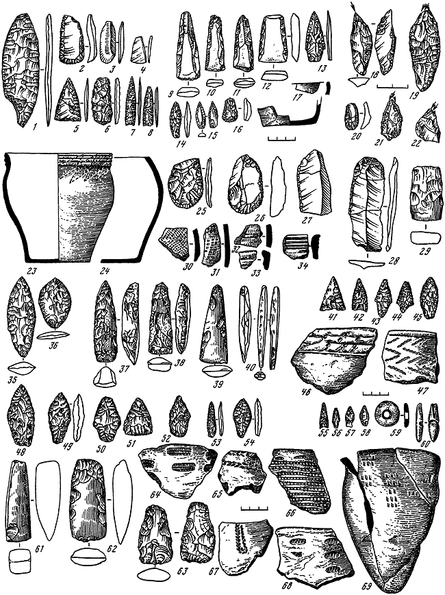 Рис. 105. Неолит Сахалина. 1-34 – Имчин II; 35–47 – Ноглики I; 48–69 – Стародубское II.
