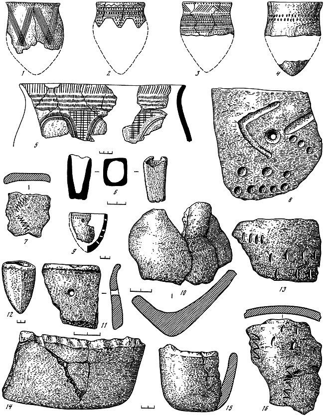 Керамика обычно хорошо заглажена, иногда подлощена, в тесте – песок или толченая раковина. Керамические формы реконструируются с трудом. Это остродонные (редко шиподонные) сосуды с S-видным профилем (рис. 7, 1–5, 10–11). Орнамент расположен в верхней части сосуда. Часто это один или два ряда ямок неправильных очертаний, реже горизонтальные полосы из прочерченных линий с точечно-ямочным заполнением между ними. Встречаются шевроны, овоидные фигуры, заштрихованные поля (рис. 7, 1–5, 8, 13).