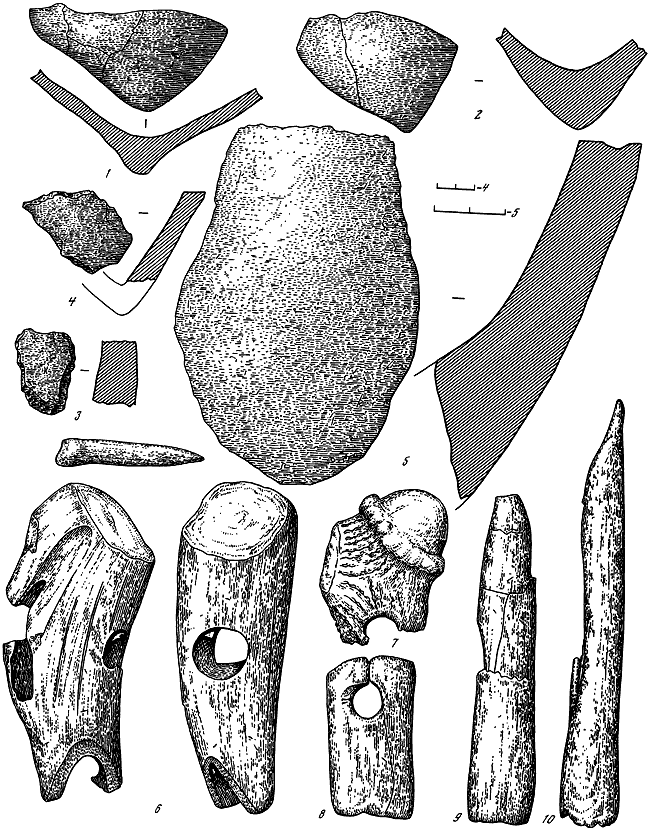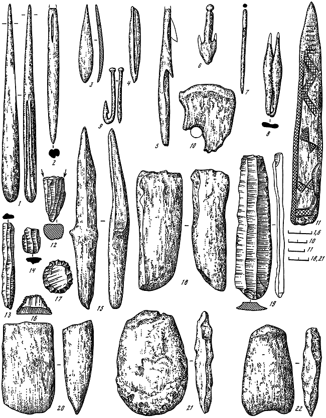 Из кости изготавливали наконечники стрел и дротиков с пазами для кремневых вкладышей, гарпуны, кинжаловидные изделия, несколько видов рыболовных крючков, шилья, проколки и т. д. Встречаются костяные тесла. На о. Шулаевом найден обломок обушковой части мотыги (?) с отверстием для рукояти (рис. 8, 10).