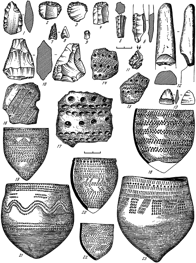 Заметно пополнились сведения и о неолите Калмыкии в связи с раскопками в 1978–1979 гг. П.М. Кольцовым (1984) стоянки Джангар. В мощном культурном слое Джангара (до 1,5 м) обнаружены остатки очагов, керамика с накольчатым и струйчатым орнаментом, много микролитического кремня, включающего геометрические формы – сегменты, трапеции и др. Сосуды с примесью раковины, реже – растительных остатков. Они были плоскодонными, венчики прямые, иногда отведены наружу. Основным орнаментальным элементом являются отступающие наколы острым концом палочки. Есть прочерченный и струйчатый орнамент. Мотивы узора – зоны, заполненные цепочками наколов, идущими горизонтально, наклонно или зигзагообразно (рис. 19). Аналогии комплексу находок кремня и керамики из Джангара пока немногочисленны. Известно несколько пунктов, обследованных Н.Д. Прасловым (1971) на Ергенской возвышенности вдоль правого берега Маныча (хутор Циганица, Курганный, Му-бузгу-Кудук и др.). Кремень, типологически близкий джангарскому, обнаружен во многих местах Прикаспия (рис. 19). Это сегменты, обработанные двусторонней ретушью, трапеции с ретушью, заходящей на спинку, ножи из пластин. Для микролитических комплексов области характерны особой формы острия и вкладыши с подтеской (сплошной или частичной) по брюшку. Эти острия-вкладыши изготавливали из узких и длинных пластин. Нуклеусы правильной круговой огранки, конические, одно– или двуплощадочные, встречаются и карандашевидные. Скребки концевые на пластинах. Резцов мало, они невыразительны. В целом инвентарь имеет архаический, почти мезолитический облик.