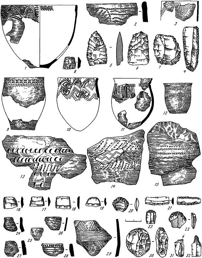 Керамика и кремень. 16–32 – первый (ранний), 9-15 – второй, 1–8 – третий этапы.