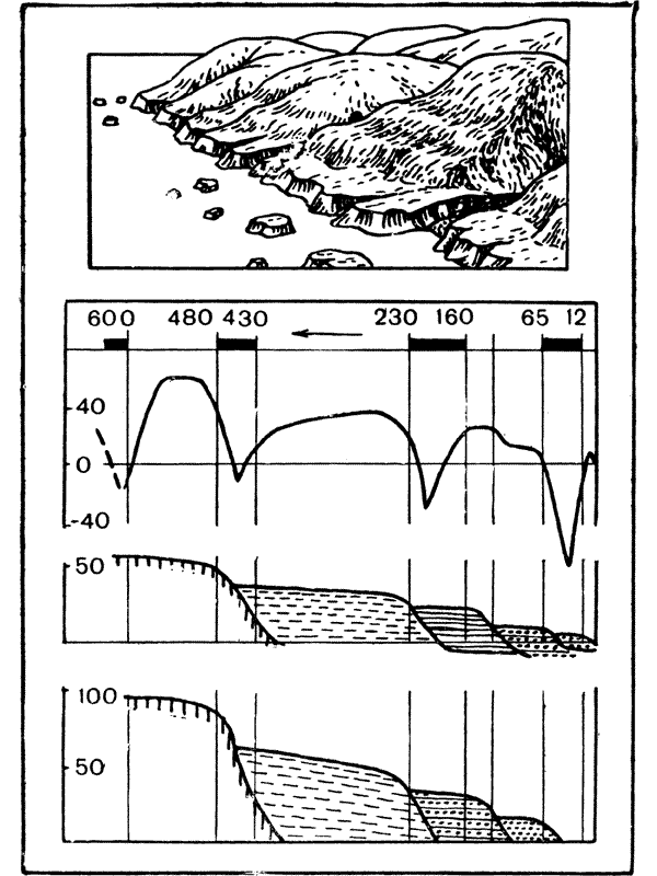 Вверху – морские террасы севернее Сан-Франциско. На графике, сверху вниз: шкала времени в тысячелетиях от настоящего, ледниковые эпохи закрашены. Линия колебаний уровня Черного моря. Схема черноморских террас. Схема средиземноморских террас. Слева – шкала высот над современным уровнем моря, в метрах.