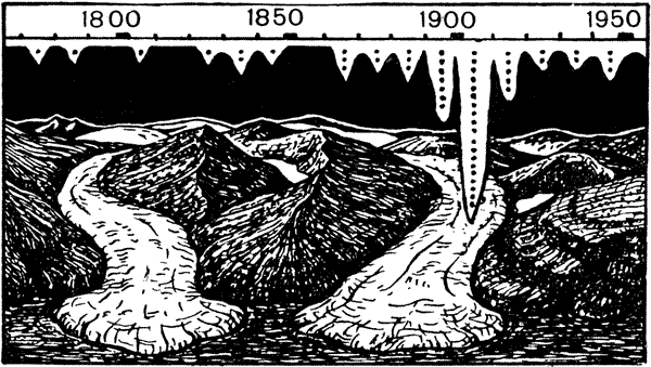 Особенно заметно было такое «брожение умов» и полная неразбериха, когда речь заходила о причинах возникновения ледниковых эпох. Немецкий геолог Шварцбах построил очень наглядный график, где показал важнейшие гипотезы в науке о ледниковом периоде в порядке их появления до второй мировой войны.