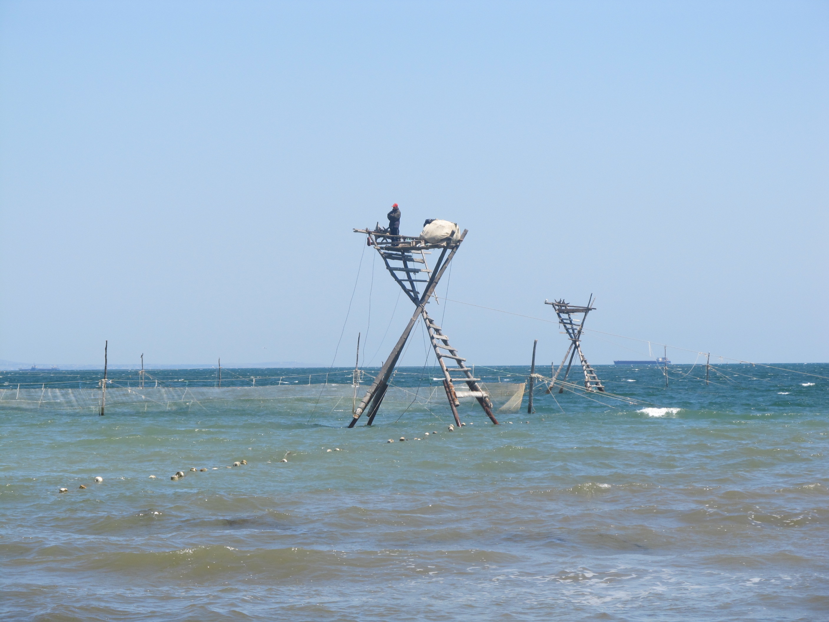 Основу его составляет четырехугольный сетной каркас, с четырьмя деревянными вышками по краям, Сетное крыло, которое идет от берега до первой вышки, преграждает путь мигрирующим косякам рыбы, направляя их внутрь сетной ловушки. При появлении косяков, сидящий на вышке смотрящий дает знать рыбакам, что рыба подошла и при заходе косяка внутрь сетного мешка вход закрывается. И рыбаки потом на баркасах спокойно ее вычерпывают. Обычно подъемный завод ставится у обрывистого берега, с крутым его изгибом, где невод хорошо защищен с суши от ветра. Сверху мне любопытно было наблюдать, как попавшая в сетной мешок рыба стремясь уйти из него, беспорядочно металась, выпрыгивая из воды, но перепрыгнуть сетную стенку не могла. Бурлящий клубок обрызгивал рыбаков серебристым каскадом опадающей чешуей кефали. Незабываемое зрелище.