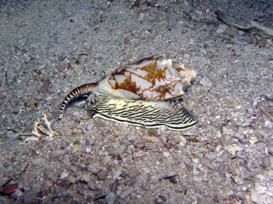 Но существуют среди них угрожающие жизни человека коварные представители подводной живности для человека – маленькие и невзрачные, но хищные брюхоногие моллюски -конусы. Их длина не более 10см.