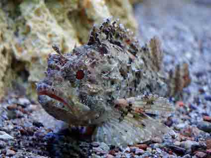 Вообще внешний вид этой рыбы довольно неприятный, и при встрече с ней, так же, как и с морским чертом, она вызывала у меня всегда брезгливое чувство. На плавниках и жаберных крышках расположены шипы и колючки с ядовитыми железами. Окраска у нее пятнистая, но в зависимости от цвета грунта, где они живут, может быть коричневой, черной, даже желтой или розоватой. Цвет меняется благодаря пигментным клеткам – хроматофорам, содержащихся в их коже. Скорпена настолько сливается с грунтом, что ее практически очень трудно заметить. Скрыться ей помогают многочисленные бугры, шипы и выросты. Они превращают ее в один из камней, поросший морской растительностью.