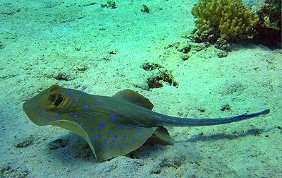 В Черном море обитает два вида скатов. Морская лисица и морской кот или скат-хвостокол. Размеры скатов в наших морях не превышают полуметра, но чаще величиной с тарелку. В тропических широтах существуют гигантские скаты и достигают в длину 3 м. Рот у ската смещен под плоскую голову, поскольку питаются донными организмами – моллюсками и крабами, а глаза и жаберные щели находятся наверху. Туловище плоское, ромбовидной формы, окаймленное с боков грудными плавничками. Скаты плавают плавно и неторопливо, широко размахивая лопастями-крыльями. Но они могут также и продолжительное время лежать на дне, не шелохнувшись, в ожидании добычи. У морской лисицы тело на спинной части покрыто шипами и колючками. Морской кот или хвостокол для человека более опасен. Хвостоколом он называется из-за мощной зазубренной иглы длиною до 10-15 см, но в тропических водах – до 40 см на хвостовом стебле, причем заполненной ядовитым секретом. Он использует его вместо оружия. Хвост у этой рыбы настолько мощный, что местные аборигены Африки использовали наконечники этих игл для своих стрел и копий. Яд, попадаю в животное (или в человека!), моментально обездвиживает жертву.