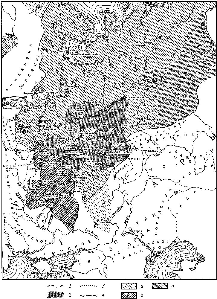 1 – граница Московского княжества в 1300 г.; 2 – граница и территория Московского великого княжества в 1462 г. (к началу княжения Ивана III); 3 – граница великого княжества Литовского к началу княжения Ивана III; 4 – граница Русского государства в 1533 г. Присоединения к Русскому государству, сделанные за период 1462–1533 гг.: а – территории ранее самостоятельных русских княжеств и земель; б – территории бывших русских княжеств и земель, возвращенных Москвой от Литовского великого княжества; в – территории нерусских народов, покоренных при Иване III и Василии III