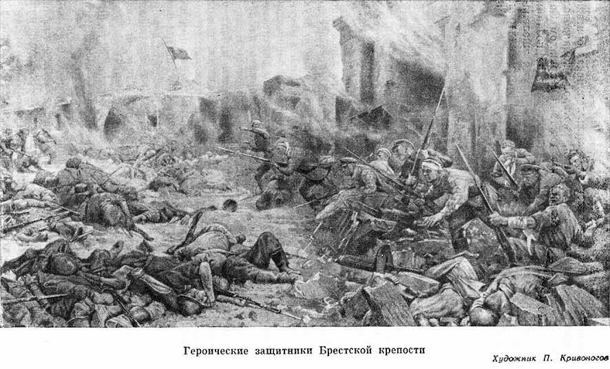 Бессмертен подвиг защитников крепости пограничного города Бреста. Фашисты рассчитывали захватить его в первый день войны. Против малочисленного гарнизона крепости оккупанты бросили несколько пехотных и артиллерийских полков. «К оружию!» – пронеслось по всем фортам и башням крепости. Брест принял бой. Под руководством офицеров-коммунистов полкового комиссара Е. М. Фомина, капитана И. Н. Зубачева, майора П. М. Гаврилова советские воины стойко и самоотверженно отражали непрерывные атаки. Борьба шла за каждый крепостной вал, каждый форт и бастион. Гитлеровцы предложили защитникам крепости капитулировать. И получили гордый ответ, написанный кровью на куске полотна и вывешенный на одной из стен крепости: «Все умрем за Родину, но не сдадимся!»