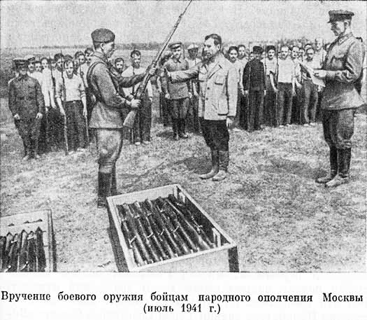 В Москве, Ленинграде, Киеве, Одессе, Туле, Харькове, Запорожье и других городах создавались части народного ополчения. В столице формирование ополчения началось в первых числах июля. В короткий срок Москва сформировала 12 ополченских дивизий. В Ленинграде в те же дни была создана армия народного ополчения в составе 10 дивизий. В Харькове был образован корпус народного ополчения. В ряды народного ополчения вступали рабочие и профессора, студенты и служащие. Не только нашим, но и зарубежным ученым хорошо известно имя астронома профессора Ленинградского университета К. Ф. Огородникова. Когда над страной нависла смертельная опасность, представитель одной из самых мирных профессий счел своим патриотическим долгом взяться за оружие. К. Ф. Огородников добровольно вступил в ряды народного ополчения и воевал с фашистами на подступах к Ленинграду, у стен своей Пулковской обсерватории.