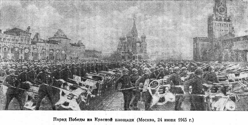 Итак, был разбит наголову еще один опасный враг. Советский народ отстоял свое Отечество, отстоял социализм. Путь советского солдата к победе был невероятно трудным. Он проходил от стен Москвы и берегов Волги до Берлина и рубежей на Эльбе, от Байкала и Амура до Порт-Артура и Южного Сахалина.