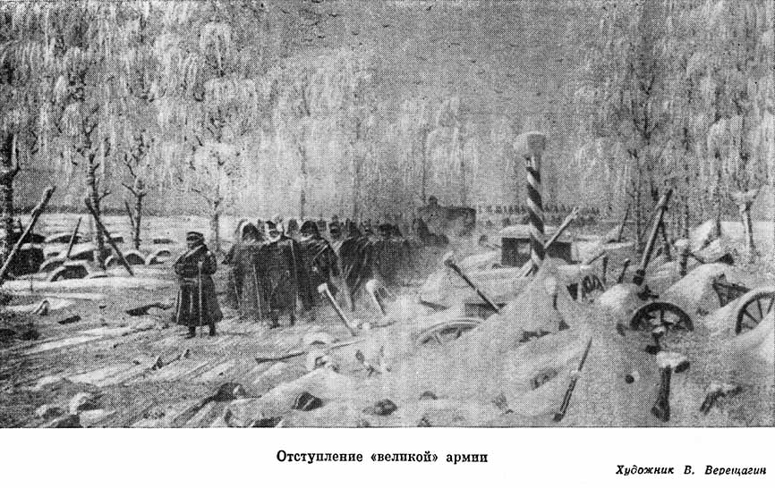 Широкое развертывание народной, «малой» войны приближало гибель наполеоновской армии. События Отечественной войны 1812 года, ее народный характер, тесная связь армии и народа являются блестящей иллюстрацией слов В. И. Ленина о том, что «вся история освободительных войн показывает нам, что если эти войны захватывали широкие массы, то освобождение наступало быстро».[54]