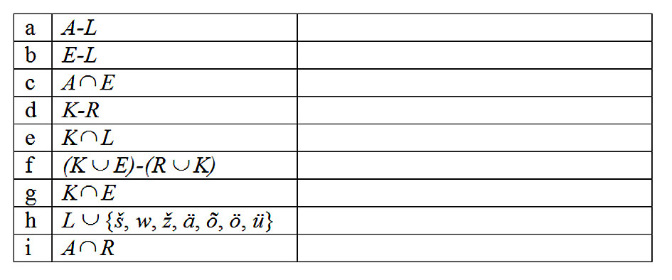 E={a, b, c, d, e, f, g, h, i, j, k, l, m, n, o, p, q, r, s, š, t, u, v, w, x, y, z, ž, ä, õ, ö, ü}.