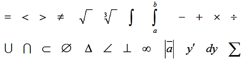 читаемые по-русски: равно, меньше, больше, не равно, корень квадратный, корень третьей степени, неопределенный интеграл, определенный интеграл, минус, плюс, умножить, разделить, объединение, пересечение, включение, пустое множество, треугольник, угол, перпендикулярно, бесконечность, модуль вектора, производная, дифференциал, сумма и многие другие.