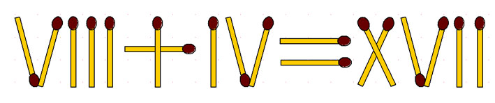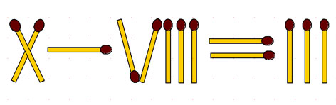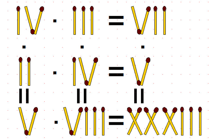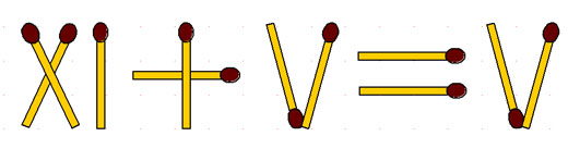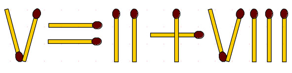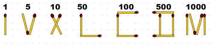 При решении задач первого урока спичками нужно будет изображать цифры и буквы. Если вы улыбнулись, прочитав эпиграф, значит с арифметикой у вас всё в порядке. Тогда дерзайте. Минимальные «системные» требования к человеку, решающему задачи этой главы – знать русский и латинский алфавиты, арабское и римское написание чисел, уметь немножечко считать. В обыденной жизни римские цифры последнее время встречаются редко, но многие спичечные задачи с числами и арифметическими примерами имеют давнюю историю и поэтому в них фигурируют цифры этой, постепенно забываемой, системы счисления. Римская нумерация, в отличие от арабской системы, не позиционная. В её основе использованы принцип сложения (например, V+I=VI, то есть 5+1=6) и принцип вычитания (например, X-I=IX, 10-1=9). Основные знаки римской нумерации, в спичечном изображении, выглядят так: