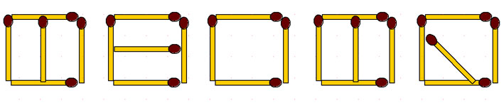 д) образуйте 5 равных квадратов, убирая : -4 спички; -6 спичек; -8 спичек;