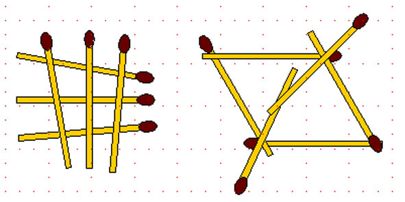 2-26. Из 18 спичек можно сложить 2 равносторонних треугольника и 3 квадрата. А попробуйте обойтись всего девятью спичками для их построения.