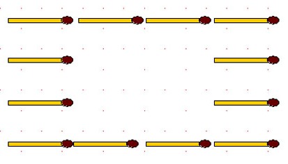 з) расположите те же 12 спичек (все спички должны лежать в плоскости стола) так, чтобы они ограничивали 5 квадратов, причём каждый квадрат должен быть пуст, в противном случае квадраты, изображенные на рисунке, могли бы служить решением, поскольку в качестве пятого мы могли бы считать большой квадрат. Не разрешается ни укладывать две спички одна на другую, ни оставлять свободные концы.