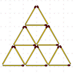 2-49. Уберите как можно меньше спичек так, чтобы оставшиеся спички образовали 4 равносторонних треугольника, таких же размеров, как и 8 треугольников в исходной конфигурации, и нигде не торчали свободные концы.