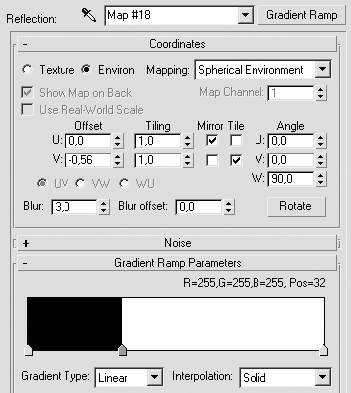 Разберем подробнее настройки этой карты. Прежде всего нужно в раскрывающемся списке Gradient Type (Тип градиента) выбрать значение Linear (Прямой), а в Interpolation (Интерполяция) – строку Solid (Постоянная). После этого назначьте два цвета: белый и черный (или близкий к черному). Для этого дважды щелкните на ползунке под шкалой градиентного перехода и в открывшемся окне Color Selector (Выбор цвета) выберите нужный цвет. Соотношение цветов должно быть близким к 1:2, то есть белый цвет должен занимать в два раза больше места, чем черный. Затем нужно повернуть карту на 90°, задав значение W для Angle (Угол) равным 90, и установить флажок Mirror (Зеркальное отображение) для координаты U. Чтобы избежать резкого перехода на стыке цветов, можно увеличить значение параметра Blur (Размытие). Можно также использовать карту Noise (Шум), чтобы еще больше сгладить резкий переход. В свитке Coordinates (Координаты) необходимо задать способ использования карты, установив переключатель в положение Environment (Окружающая среда), а из списка Mapping (Проекция), который определяет способ наложения координат, выбрать Spherical Environment (Сферическая фоновая), так как вы создаете карту для окружения. На этом с основными настройками можно закончить. В результате вышеописанных операций у вас должна получиться процедурная карта, подобная показанной на рис. 4.39.