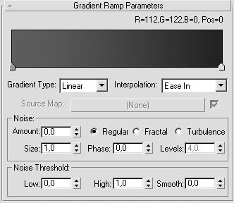 8. В свитке Gradient Ramp Parameters (Параметры улучшенного градиента) настройте отображение цветов градиента на цветовой шкале. Для этого дважды щелкните на левом ползунке, чтобы вызвать окно Color Selector (Выбор цвета).
