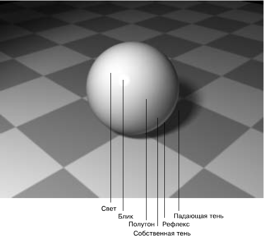 Освещение часто является фундаментом для цветового моделирования, придающего сцене акцент и глубину. Предметы в сцене не будут выглядеть плоскими, если их прорисовать светотенью, то есть характером распределения освещенности по форме в зависимости от положения ее различных поверхностей по отношению к источнику света. Чтобы предметы выглядели объемными, на них должны присутствовать свет, блик, полутон, а на самой затененной части поверхности – собственная тень (рис. 5.1). Последняя всегда в той или иной степени подсвечена светом, отраженным от других предметов, так называемым рефлексом. Наконец, предметы отбрасывают от себя на соседние предметы падающую тень, которая обычно бывает темнее собственной тени. Только при правильном соотношении этих световых фаз можно с предельной правдоподобностью передать объем предмета.