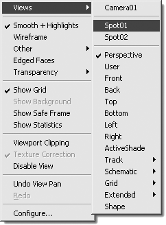 Для построения такой карты нужно выделить источник света, который будет отбрасывать тень, и в любом окне проекции (например, в окне Left (Cлева)) выбрать вид из этого источника. Для этого щелкните на названии окна проекции правой кнопкой мыши, в результате чего появится контекстное меню (рис. 5.12), в котором следует выбрать нужный источник света (в моем случае это Spot01), выполнив команду Views ? Spot01 (Вид ? Объект Spot01).