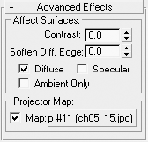 3. В окне Clone Options (Параметры клонирования) также задайте объекту значимое имя, чтобы впоследствии было легче выбирать его из списка, например shadow.После этого активизируйте источник света (если он до сих пор не выбран) и разверните свиток Advanced Effects (Дополнительные эффекты), где в качестве Projector Map (Карта прожектора) выберите вашу карту тени (рис. 5.16).