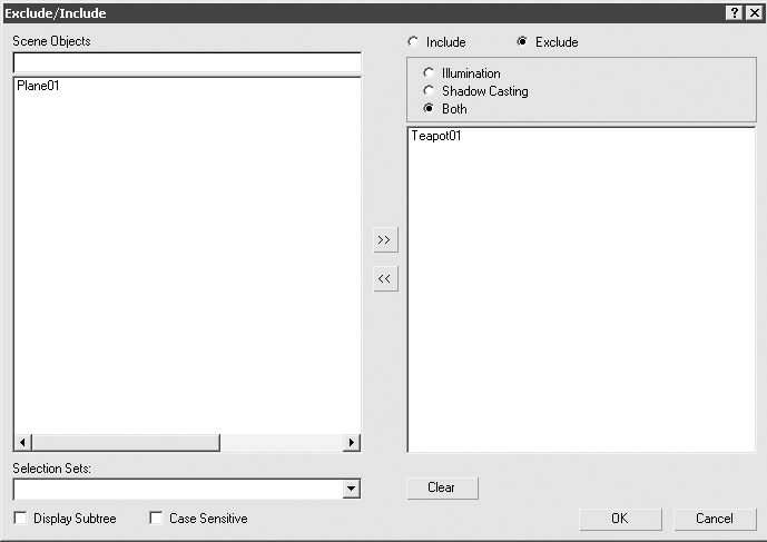 Рис. 5.17. Окно Exclude/Include (Исключение/включение) с исключенным из освещения чайником