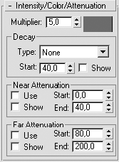 Рис. 5.20. Свиток Intensity/Color/Attenuation (Интенсивность/цвет/затухание) с настройками для источника света