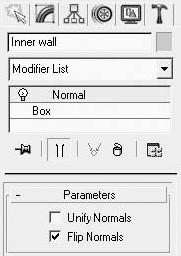 Не снимая выделения с вновь созданного параллелепипеда, примените к нему модификатор Normal (Нормаль). Для этого выберите его в раскрывающемся списке вкладки Modify (Изменение) командной панели. В свитке Parameters (Параметры) настроек модификатора установите флажок Flip Normals (Обратить нормали) (рис. 5.25).