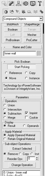 Выделите комнату. Перейдите на вкладку Create (Создание) командной панели, щелкните на кнопке Geometry (Геометрия), выберите из раскрывающегося списка строку Compound Objects (Составные объекты) и нажмите кнопку ProBoolean (Pro Булев). В результате появится панель с настройками булевых операций (рис. 5.26).