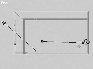 В свитке Pick Boolean (Указать булев) щелкните на кнопке Start Picking (Указать) и выберите параллелепипед, построенный по форме окна. В результате этих операций в стене образуется оконный проем. Чтобы видеть интерьер комнаты, расположите внутри ее камеру и источник света (например, Omni (Всенаправленный)). Снаружи напротив окна нужно установить еще один источник света. Это должен быть Target Spot (Направленный с целью), расположенный в пространстве таким образом, чтобы лучи света, проходя через окно, падали на пол комнаты (рис. 5.27).