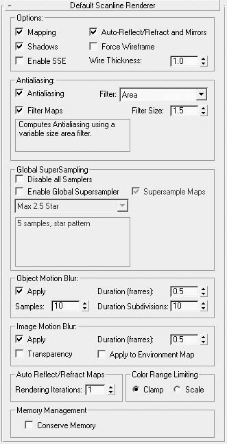 • Filter Maps (Фильтрация текстурных карт) – фильтрация текстурных карт (фильтрация улучшает отображение материалов, использующих текстурные карты, но увеличивает время визуализации);