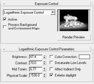 С его помощью можно, например, осветлить слишком темные сцены без изменения настройки источников света. Небольшое окно предварительного просмотра позволяет увидеть все изменения, которые производятся при помощи параметров свитка Logarithmic Exposure Control Parameters (Параметры логарифмического контроля экспозиции).