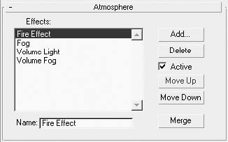 Atmosphere (Атмосфера)Свиток Atmosphere (Атмосфера) (рис. 8.9) дает доступ к четырем типам атмосферных эффектов: Fire Effect (Эффект огня), Fog (Туман), Volume Fog (Объемный туман) и Volume Light (Объемный свет).