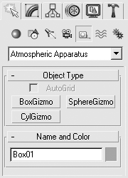 Атмосферные эффекты являются визуальными эффектами, позволяющими имитировать такие природные явления, как дым, огонь, туман, облака, взрывы и т. п. Эффекты, примененные к сцене, становятся видимыми только после визуализации.Зона действия атмосферных эффектов может быть ограничена различными способами: ближней и дальней границами, границей светового луча, настройками параметров. Чтобы ограничить действие эффектов Fire Effect (Эффект огня) и Volume Fog (Объемный туман), применяется габаритный контейнер. Он задает границы пространства сцены, в пределах которого будет формироваться эффект. Для создания габаритного контейнера необходимо щелкнуть на кнопке Helpers (Вспомогательные объекты) вкладки Create (Создание) командной панели и выбрать из раскрывающегося списка Atmospheric Apparatus (Атмосферная оснастка) (рис. 8.10).
