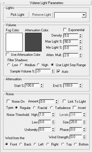 С помощью свитка Volume Light Parameters (Параметры объемного света) можно настроить параметры в следующих областях.
