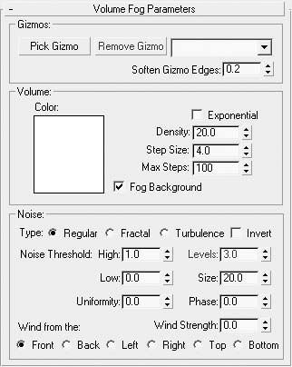 ? Gizmos (Габаритные контейнеры) – предоставляет возможность выбрать габаритный контейнер (кнопка Pick Gizmo (Указать контейнер)) либо удалить его из списка (кнопка Remove Gizmo (Удалить контейнер)). Soften Gizmo Edges (Сглаженные края габаритного контейнера) – счетчик в диапазоне от 0 до 1, позволяющий задавать размытость краев эффекта тумана. Не рекомендуется использовать в качестве значения 0, так как это может стать причиной жестких, ступенчатых краев.