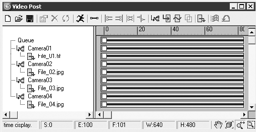 Рис. П 1.12. Окно модуля Video Post (Видеомонтаж) с настройками последовательной визуализации вида четырех камер