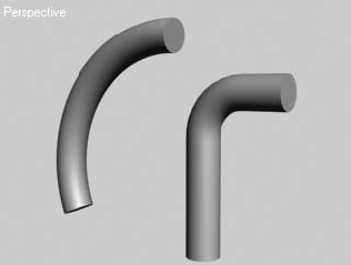 Рис. 2.37. Цилиндр после применения модификатора Bend (Изгиб) со значением угла изгиба 90° (слева) и его копия с ограничением области воздействия и центром модификатора, передвинутым вверх (справа)