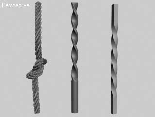 Модификатор Twist (Скручивание) применяется для создания деформации скручивания. Чаще всего он используется при конструировании витых спиралевидных моделей: веревок, сверл, резьбы, кованых решеток, ювелирных украшений и т. п. (рис. 2.38). Для корректного применения модификатора объект должен иметь достаточное количество разбиений в направлении оси изгиба.