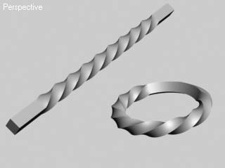 Рис. 2.40. Параллелепипед после применения модификатора Twist (Скручивание) (слева) и его копия, к которой дополнительно применен модификатор Bend (Изгиб) (справа)