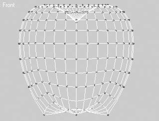 7. В окне проекции Front (Спереди) выделите две вершины, находящиеся в третьем ряду снизу и в середине объекта (одна на лицевой стороне, другая на противоположной). Затем, удерживая нажатой клавишу Ctrl, добавьте к выделению две такие же вершины в окне проекции Left (Cлева). Таким образом, должно быть выделено четыре вершины, расположенные в третьем ряду снизу и равноудаленные друг от друга.8. Не меняя настройки плавного выделения, переместите выделенные вершины немного вниз, сформировав таким образом нижнюю часть яблока (рис. 2.43).