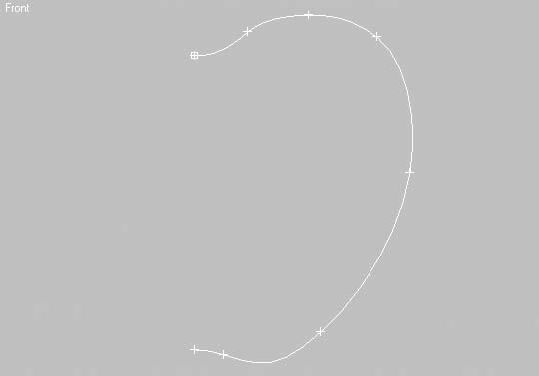 Начинайте построение формы профиля для тела вращения с вертикальной линии, определяя таким образом начальную и конечную точку сплайна, постепенно добавляя новые вершины (команда Refine (Уточнить)) и редактируя их положение в пространстве. Кроме того, можно строить профиль, последовательно создавая вершины от начала до конца. В этом случае необходимо следить за тем, чтобы первая и последняя вершины сплайна находились на оси вращения, для чего используйте привязки к сетке.