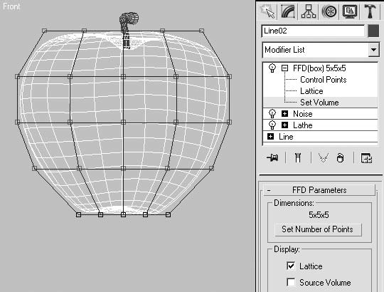 2. Выделите модель яблока и примените к ней модификатор FFD Box (Произвольно деформируемый контейнер (прямоугольный)), для чего выполните команду Modifiers ? Free Form Deformers ? FFD Box (Модификаторы ? Произвольные деформации ? Произвольно деформируемый контейнер (прямоугольный)).